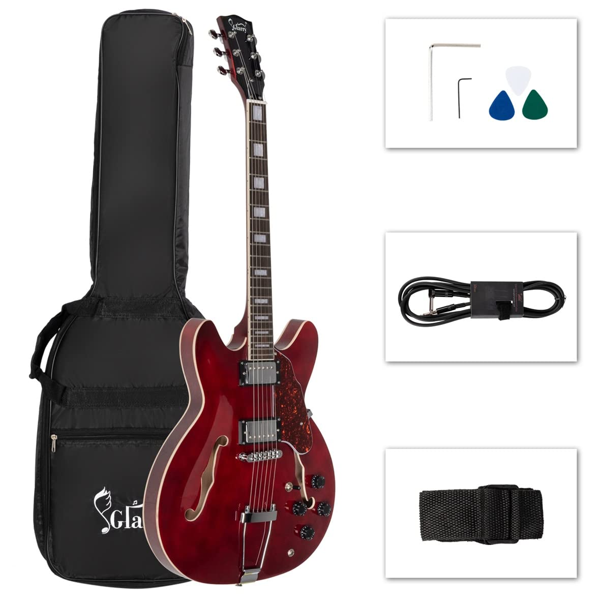 Amazon Com Glarry Gjazz Semi Hollow Body Electric Guitar Humbucker Pickups With Guitar Strap Bag Cable And 2 Picks Transparent Wine Red Musical Instruments